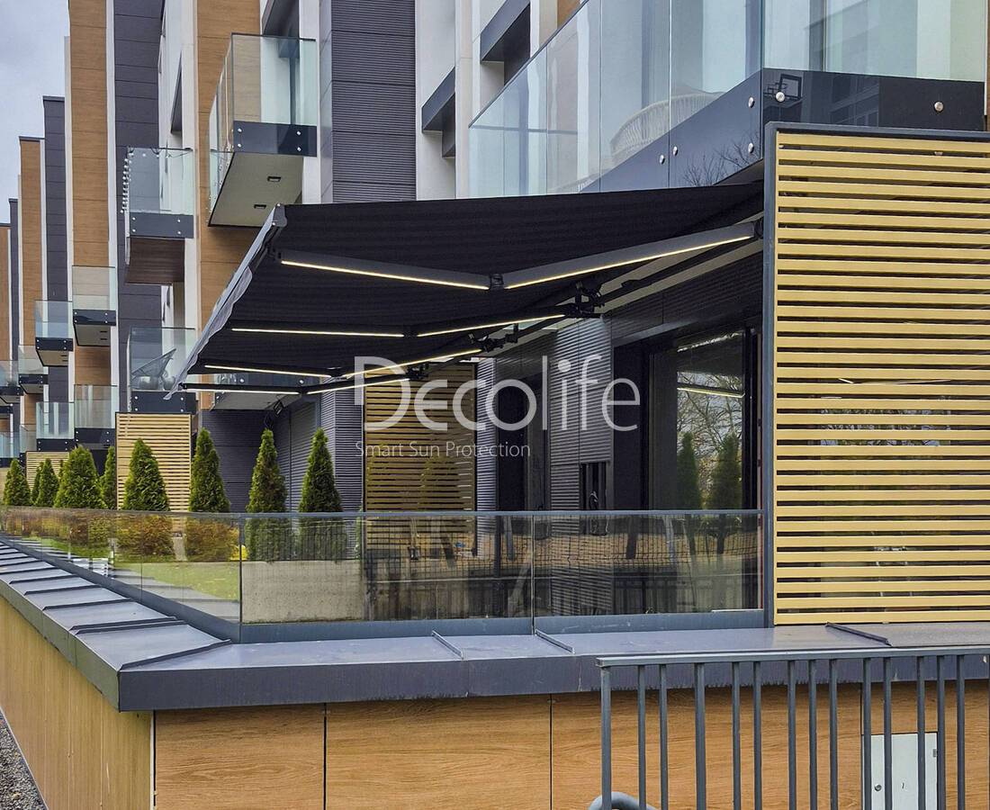 Маркизы управляются электроприводом в автоматическом режиме, работают тихо и не нуждаются в сложном техобслуживании.