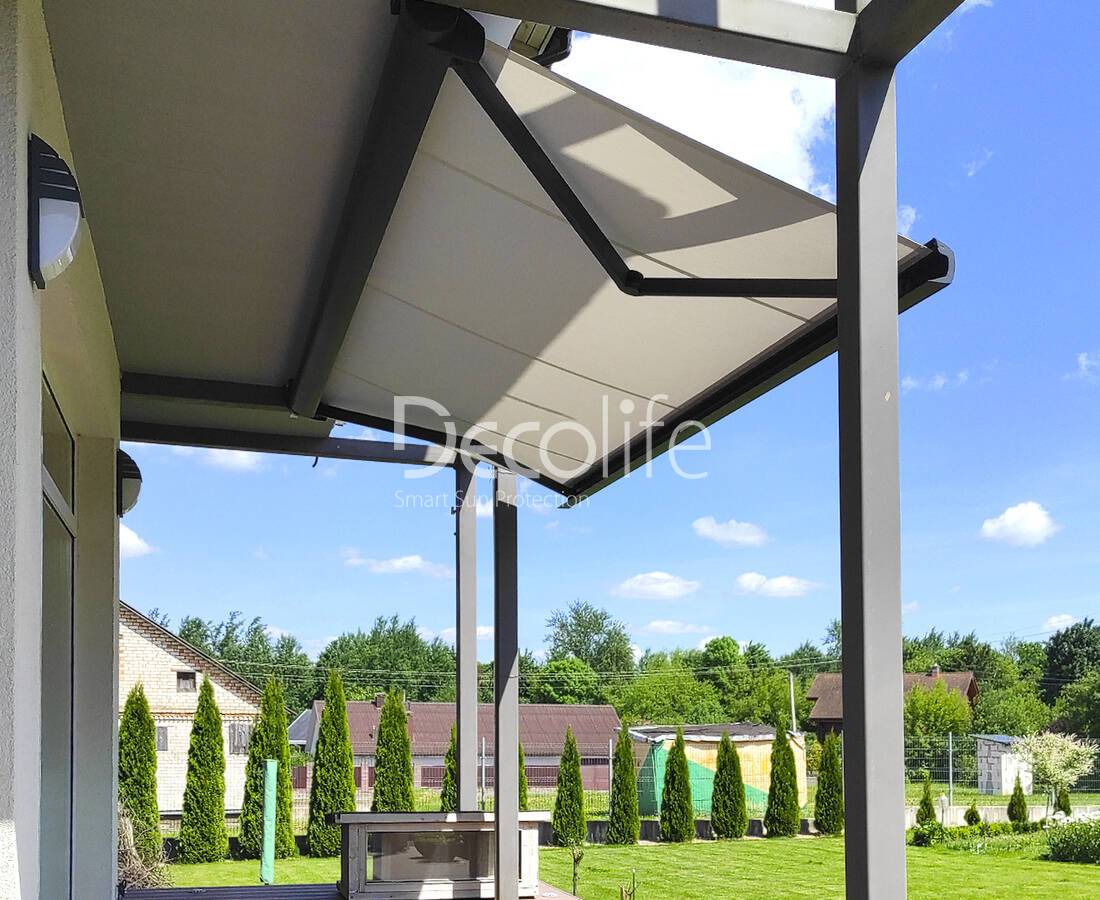 Полотно надежно защищено от нежелательных воздействий чехлом. Материал, надежно закрепленный на маркизе, можно сворачивать вручную либо с помощью встроенной автоматики.