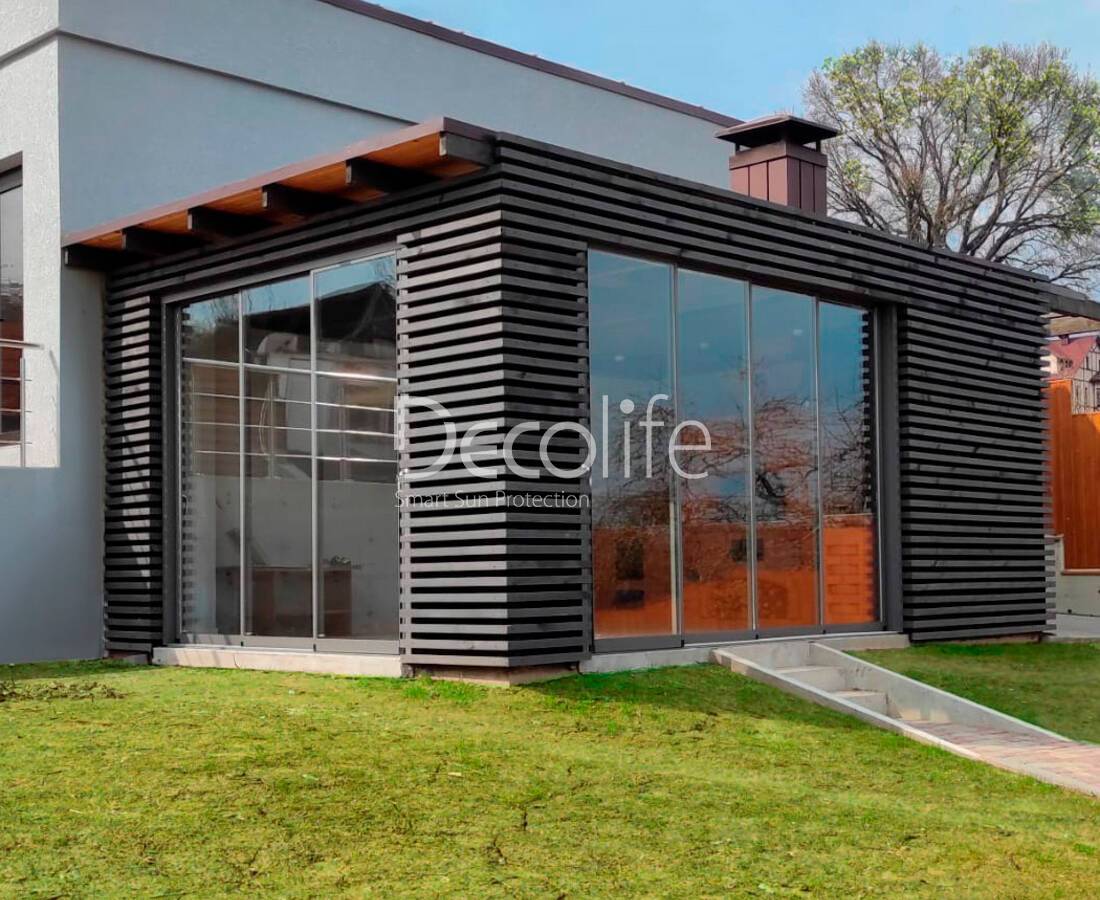 Пергола биоклиматическая Decolife В700-20C + Раздвижное остекление S500 + Вертикальная система Zip 100 - г. Истра